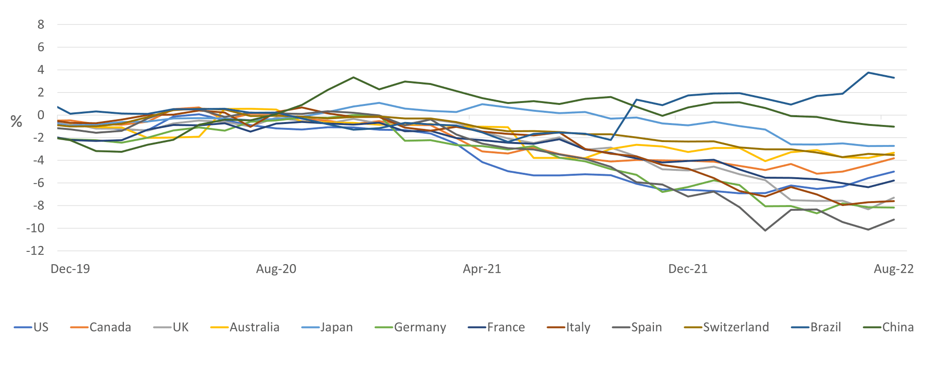 There’s now a stark contrast in after-inflation (real) yields across many government bond markets. Consider the more than 3% yield for Brazil’s local currency bonds at the end of August, compared to the -9% for Spain’s equivalent after relatively little yield difference during the pandemic’s onset (see Exhibit 1).1 This mixed picture suggests that economies and policies are becoming deeply out-of-sync regarding how and when they might exit the current inflation-led regime.