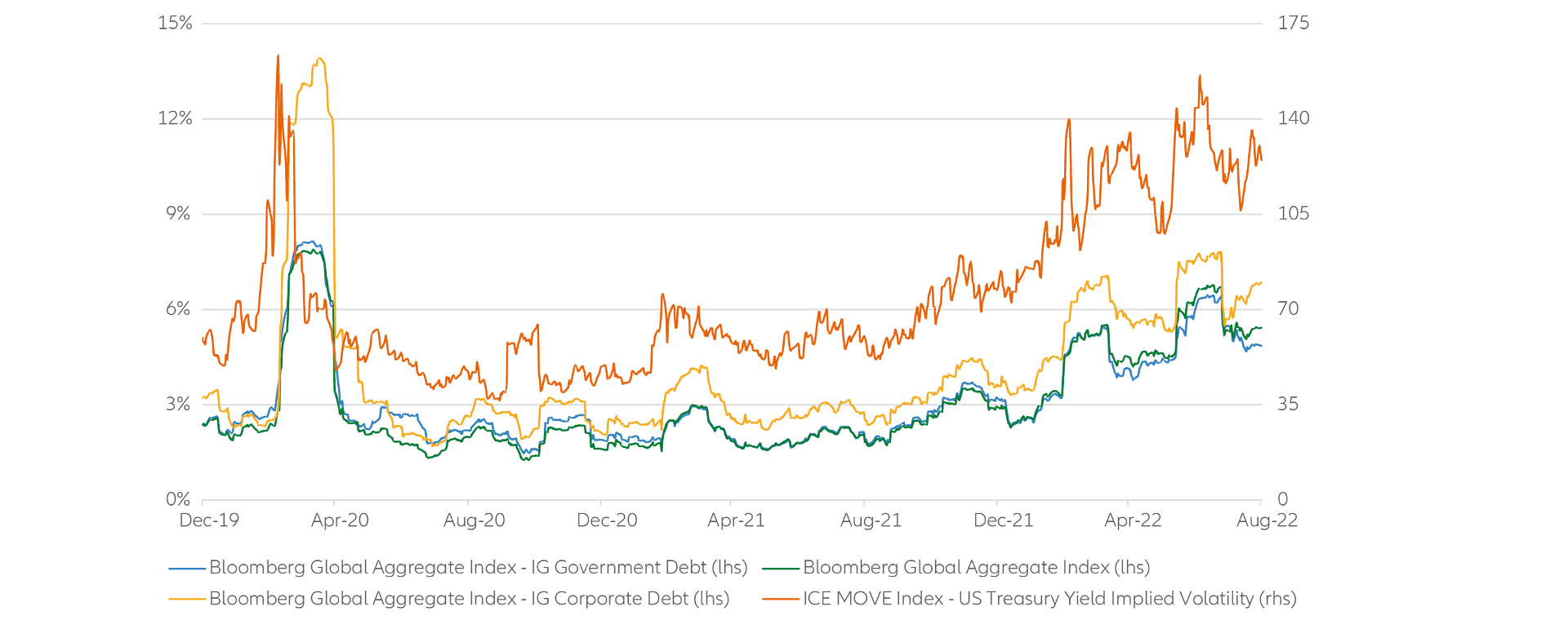 Source: Bloomberg and ICE BofA indices. Allianz Global Investors. Data as at 31 August 2022. Index returns in USD (hedged). Realised volatility (30 days trailing) is annualised. IG= bonds rated Investment Grade. lhs=left-hand-side axis. rhs=right-hand-side axis. The rhs axis represents the value of the MOVE. which is a yield curve-weighted index of the normalised implied volatility on 1-month Treasury options on the 2. 5. 10 and 30-year contracts over the next 30 days. A higher MOVE value means higher option prices. Past performance does not predict future returns. See the disclosure at the end of the document for the underlying index proxies.