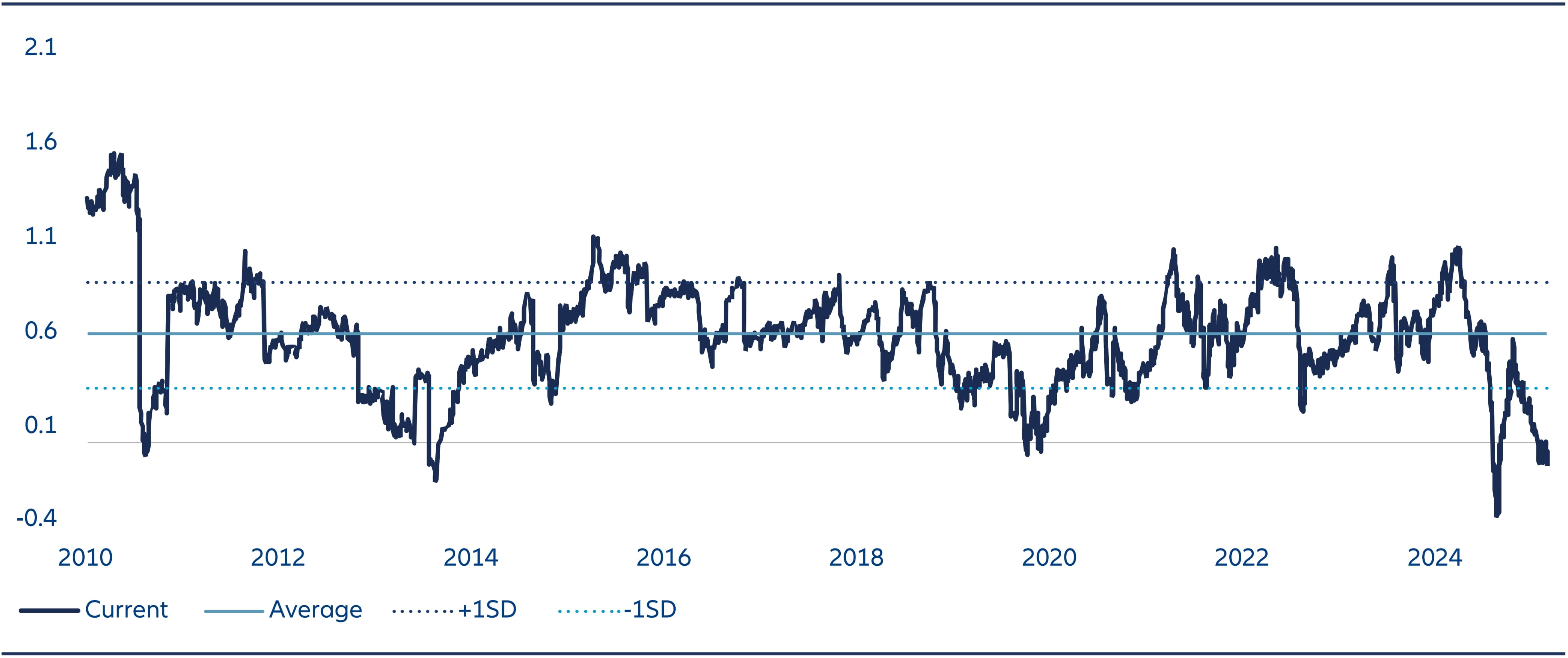 Source: Bloomberg, Allianz Global Investors, as of 31 August 2025. The average valuation is calculated over the period of past 15 years, or since data became available.