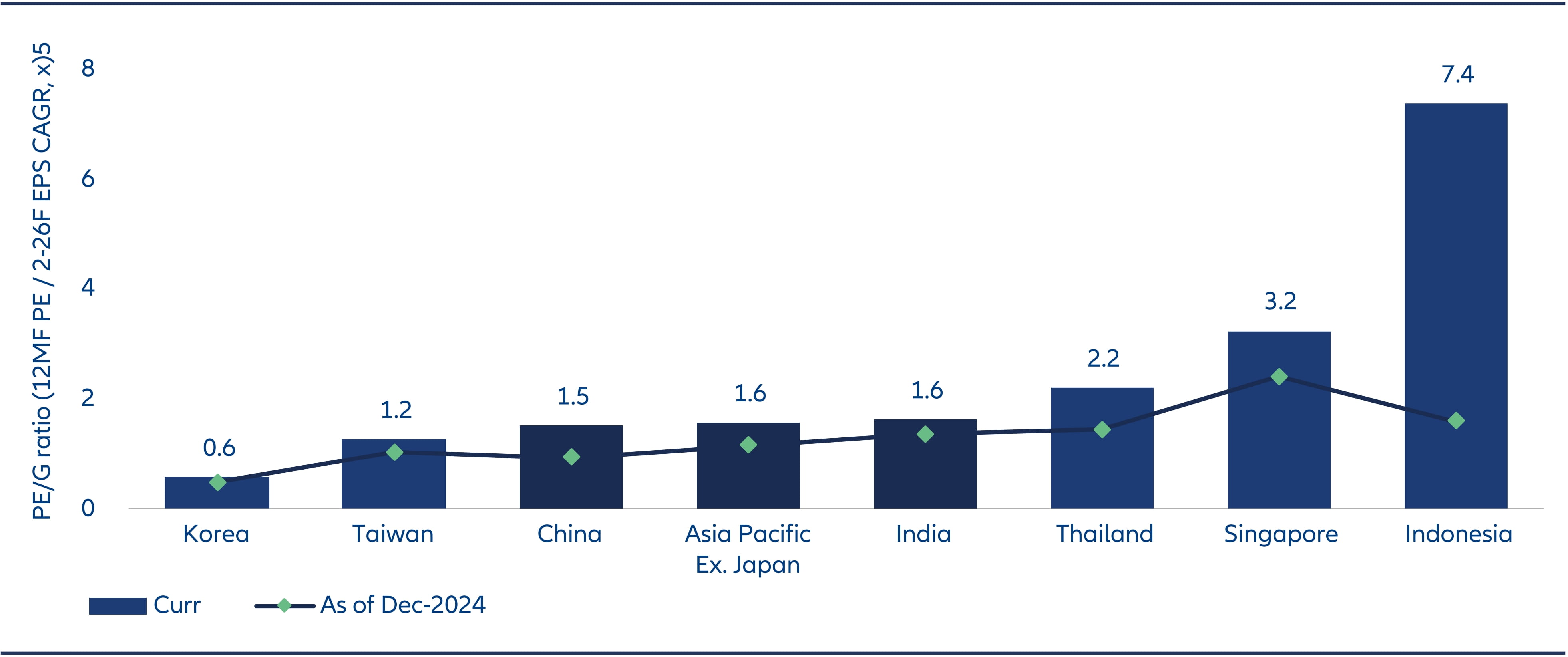 We see both as short-term dislocations. India’s longerterm earnings trajectory remains intact, underpinned by reforms, robust domestic demand, and policy stability. Another way of looking at Indian equity valuations is through the lens of Price-to-Earnings Growth (PEG ratio). India’s PEG is on par with the regional MSCI AC Asia Pacific ex Japan index and almost at the same levels as MSCI China, for comparison.
