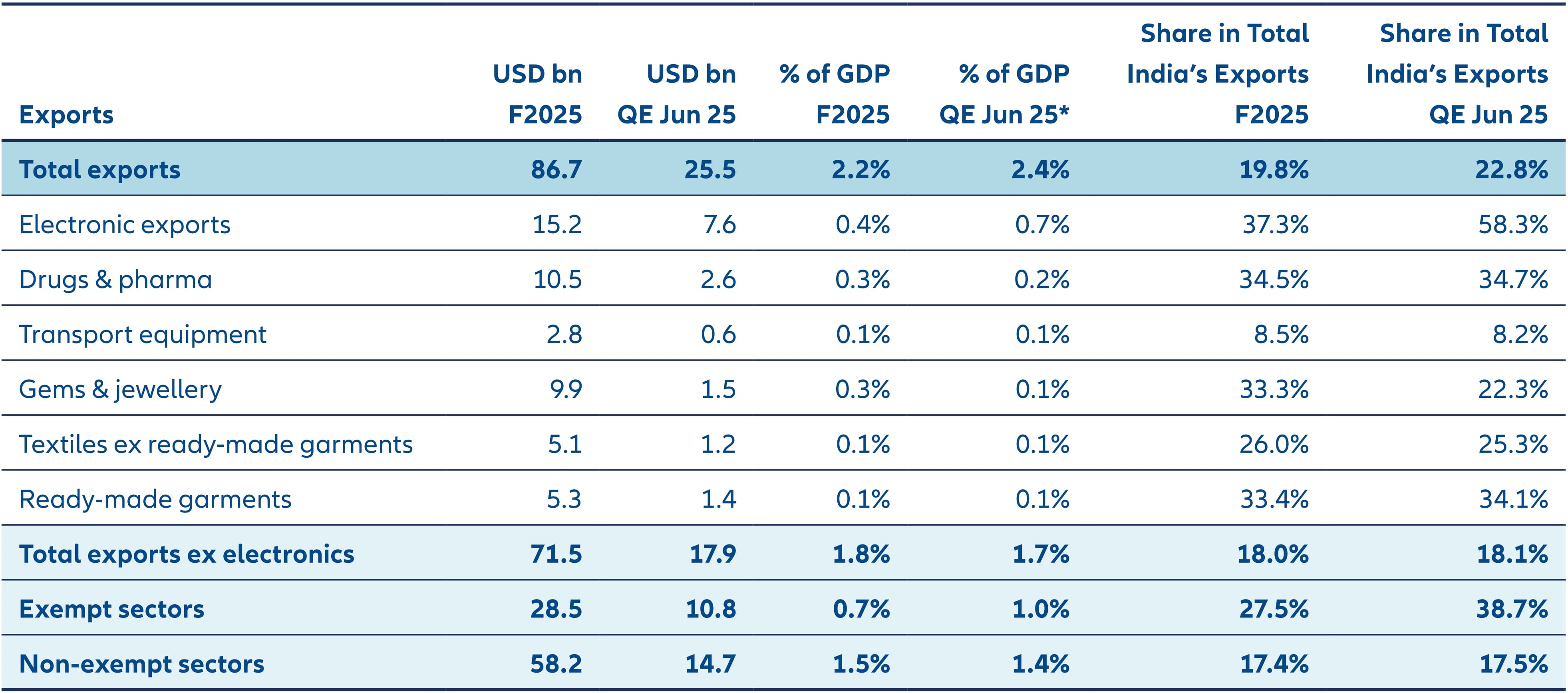 Against this backdrop, the US administration doubled tariffs on Indian exports to 50%, penalizing continued imports from Russia. The measure affects 67% of India’s exports into the US (USD 58bn, ~1.5% of GDP). Our sensitivity analysis suggests a direct growth drag of ~40bps with a similar magnitude of indirect impact. The table below shows the sectoral composition of exports. From an equity market perspective, less than 2% of MSCI India’s weight would be directly exposed to the 50% tariff.
